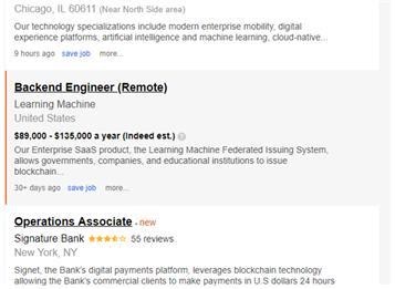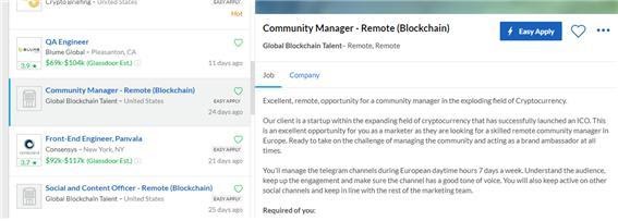 블록체인의 개발자 또는 엔지니어들도 예외는 아니다. 다만, 위의 이유외에 또 다른 이유로 원격 근무를 채택하기도 한다. 앞서 알아본 것처럼, 숙련된 블록체인 개발자, 엔지니어는 전 세계적으로도 부족한 상태이다. 이러다보니 고급 인력의 확보를 위해 국가나 대륙을 넘어선 원격 근무나 재택 근무형태의 채용은 드문 현상이 아니다. 실제로 미국의 유명 취업사이트에서 블록체인과 관련된 원격 채용은 쉽게 찾아 볼 수 있다. 아래의 예처럼 블록체인 커뮤니티 매니저를 원격 근무 가능으로 채용하는 공고도 있다.