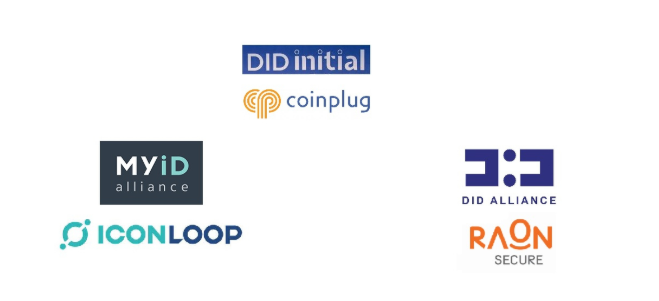 | 주요 3개 DID 연합 및 참여 기업의 로고. (상단부터 시계방향으로) '이니셜 DID' 연합의 코인플러그, 'DID 얼라이언스'의 라온시큐어, '마이아이디 얼라이언스'의 아이콘루프. [각사 제공] |